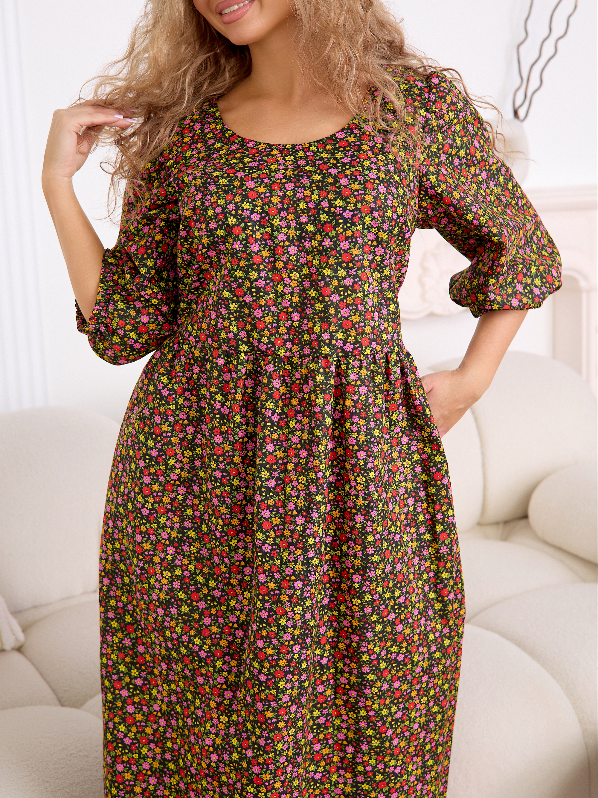 Рукав 3/4 с резинкой внизу — практичная и стильная деталь, которая завершает образ в духе «платья-крестьянки».